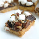 7) Spread the warm chocolate atop the cookie crust. Sprinkle with the marshmallows, then the pecans.