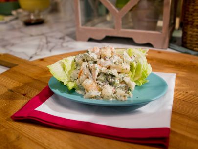 To make the salad: In a large bowl, combine the dill, grated garlic, mayonnaise, sour cream, yogurt, cucumber, onion, lemon zest, and sugar. Taste, and then season with a pinch of salt and a few grinds of black pepper. Remove the shrimp from the ice bath, dry gently with a paper towel, and coarsely chop. Stir them into the dressing until combined.