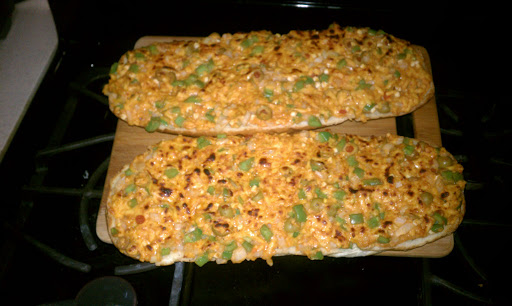 Mix first 8 ingredients. Spread sut surface of bread with the butter. Divide mixture between halves, distributing evenly. Broil 4" to 5" from heat 5 minutes, or until cheese is melted and brown. Cut each loaf into 6 slices.