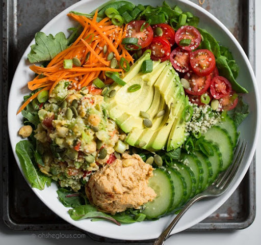 Add greens into a large bowl. Layer on your desired toppings and drizzle on the dressing and garnish with hemp/pepita seeds.
