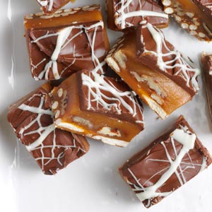 Line a 13x9-in. pan with foil; grease foil with softened butter. Spread pretzels and pecans on bottom of prepared pan.