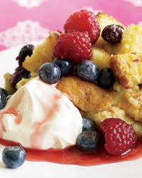 Preheat the broiler. Broil the pudding for 1 minute, until golden brown. Transfer to a rack and let stand for 30 minutes, until cooled slightly. Cut the bread pudding into squares and serve with blueberries, raspberries and whipped cream.