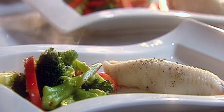 3. In a large skillet or wok over medium-high heat, sauté the garlic cloves in the oil until golden. Discard the garlic cloves. Add the broccoli and red pepper. Season with salt and pepper. Stir-fry until tender, 3 to 4 minutes. Set aside and keep warm while you cook the fish.