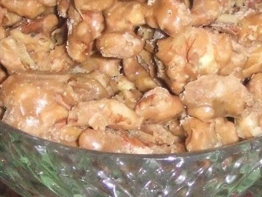 Over medium heat in a medium pot stir together both sugars and sour cream until sugars have melted. Cook to soft ball stage (236 degrees) then stir in Vanilla. Stir until mixture begins to thicken and add nuts. Stir until coated. Spread nuts out onto cookie sheet covered with wax paper and coated in cooking spray. Let cool then break into pieces for serving.