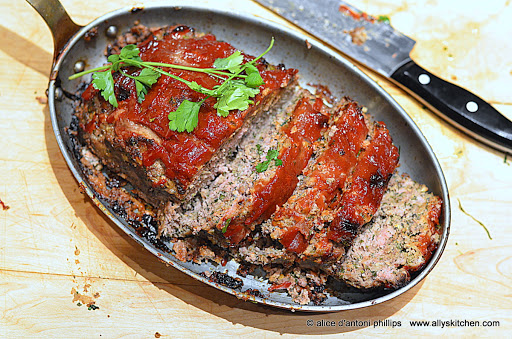 Combine the ketchup, Worcestershire, salt, hot sauce, cumin and remaining olive oil in a small bowl and blend. Pour this on top of the meatloaf and spread to cover the top. Drizzle (zigzag) with some more ketchup.