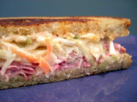 Lay the bread slices on a clean work surface and spread 1 side with the Russian Dressing. Layer the corned beef, followed by the sauerkraut, the slices of Swiss Cheese and then the cole slaw. Place the remaining bread slices on top, dressing sides down,and set aside.