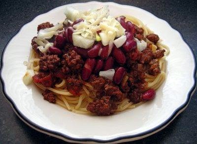 5-way: Spaghetti topped with beans, chili, cheese & onions