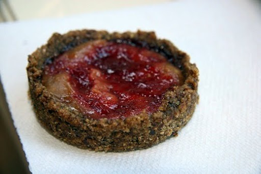 Mix crust together with a hand blender in a medium sized bowl. Place approx 1 tsp of crust dough into pre-greased mini muffin tin (or use 1 T of crust in a regular muffin tin). Press down to create a mini crust making sure the crust comes up on the sides a bit. Add filling, filling the tin about half only, and top with jam and chocolate or carob chips. Bake at 350F for 15 minutes. Makes 24 mini cups.