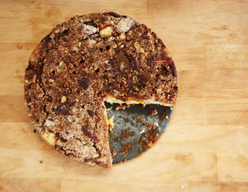 Bake for 60-75 minutes (depending on the color of your cake pan) until a skewer (wooden or metal) comes out crumby, but clean. If your nuts start to get too dark (dark brown good, burnt bad), apply foil over the top of your pan to halt that process and allow the cake to continue cooking. Remove from oven and allow to cool for at least 15 minutes in the pan. Serve and enjoy!