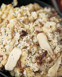 In a large skillet, cook the bacon over low heat, stirring, until crisp, about 7 minutes. Add the onions and cook, stirring occasionally, until softened, about 12 minutes. Add the potatoes, season with salt and pepper and toss to coat.