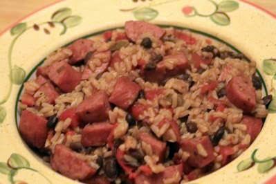 My husband loves red beans and rice, but I am very much not a fan of red beans. I do, however, love black beans, so tonight I threw this together. We decided it was a keeper.