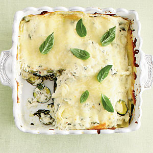 3. Spoon one-third of vegetables into a lightly greased 9-inch square baking dish; top with 2 noodles and one-third of ricotta mixture. Repeat twice. Sprinkle with mozzarella.