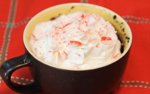 Place all ingredients (minus crushed candy cane) in the mug and mix together, being sure to scrape the bottom and sides to incorporate all dry ingredients into the wet.