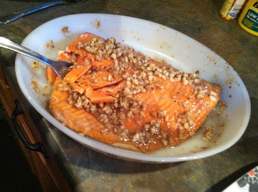 Turn the salmon fillets. Mix the crushed pecans with the remaining cider glaze and fresh black pepper to taste. Brush the tops of the fillets with the remaining pecan and cider glaze. Add the lemon halves to the skillet, then transfer the skillet to the oven. Bake for 6-8 minutes, or until the salmon flakes easily.
