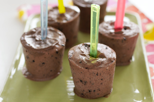 Spoon into 9 (3-oz.) paper or plastic cups. Insert wooden pop stick or plastic spoon into each for handle. Freeze 5 hours or until firm.