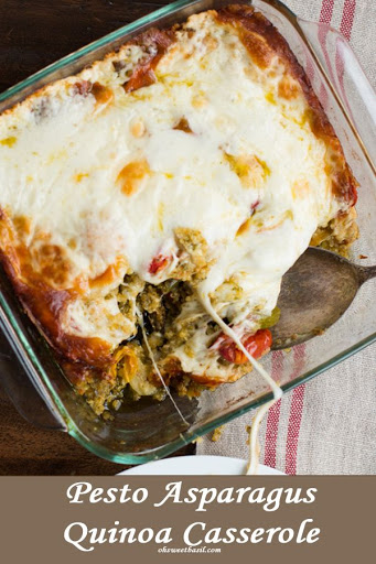 Heat the oven to 400 degrees. Place the tomatoes and asparagus on a baking sheet and drizzle with olive oil and sea salt. Roast for 45 minutes. Remove from the oven and toss with the quinoa and pesto. Sprinkle the top with cheese and bake for 20 minutes or until the cheese is browning and melted.