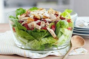 PLACE lettuce in medium serving bowl; top with layers of croutons, chicken and tomato mixture.