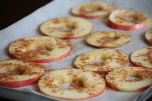 3. Line a cookie sheet with parchment paper and place apple slices on it.