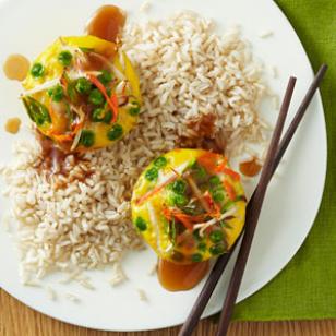 Egg foo yong is a Chinese omelet filled with vegetables, bean sprouts and sometimes meat. Our vegetarian egg foo yong recipe is packed with vegetables and baked in a muffin tin for ease. Serve with a mixed green salad tossed with sesame dressing.