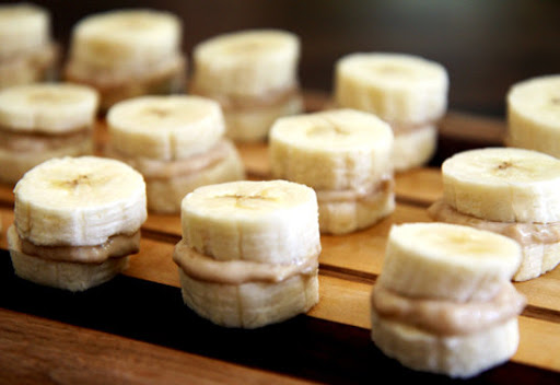 2. Peel the other 3 bananas slice into 1/2 inch thick slices. Smear the banana, PB and yogurt mixture on 1/2 the banana slices and top with the other halves, making banana sandwiches.