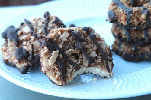 1. Start by gently coating top and sides of each cookie with a minimal amount of caramel.