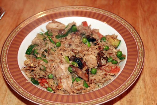 4. Put remaining oil in skillet, followed by garlic and ginger (be sure NOT to burn it!). About 15 seconds later, add rice, a bit at a time, breaking up clumps with your fingers and tossing it with oil. When all rice is added, make a well in the center and break eggs into it; scramble them a bit, then incorporate into rice.