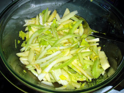 Celery and Apple salad - simple yet delicious enough to forget about the cold winds billowing outside. The tart and tangy flavor of the celery contrasts with the sweetness of the apple and the mustard and lemon vinaigrette binds it all together nicely. Oh! you can even incorporate the leaves of the celery (which I usually discard) into the salad. Now, you can really use any kind of apple but, to keep the flavors balanced, I would recommend a Golden Delicious or Gala over Granny Smith.