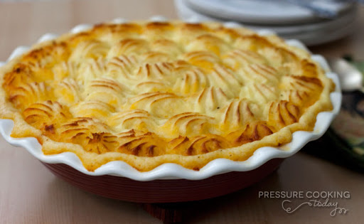 Combine the cornstarch and water, whisking until smooth. Add cornstarch mixture to the pressure cooking pot. Select Simmer and bring to a boil, stirring constantly. After sauce thickens, taste, adjust seasoning if necessary. Add the parsley, corn and peas to the meat mixture. Pour meat mixture into the bottom of prepared baking dish or pie plate.