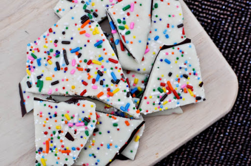 Melt while chocolate. Whisk in cake mix slowly, stirring well until no lumps remain. Let it set for 3 full minutes (or at least until it slightly thickens). Remove baking sheet with chocolate from the freezer and immediately pour white chocolate on top. Sprinkle on sprinkles. Freeze for 20 minutes.