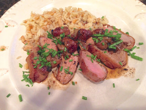 Add about 1 tablespoon olive oil to a large saute pan. Place the duck in the pan skin-side down. Bring the pan to a medium heat and cook the duck breasts low and slow to allow the fat to render and so the skin can get nice and crispy. As the fat renders out of the duck, pour or spoon it out of the pan and SAVE IT for another purpose. (It's yummy!) Cook the duck for 8 to 9 minutes on the skin side. Turn the duck over and cook the duck for 2 to 3 minutes on the flesh side. Remove the duck from the pan, cover with foil and let rest for about 10 minutes.