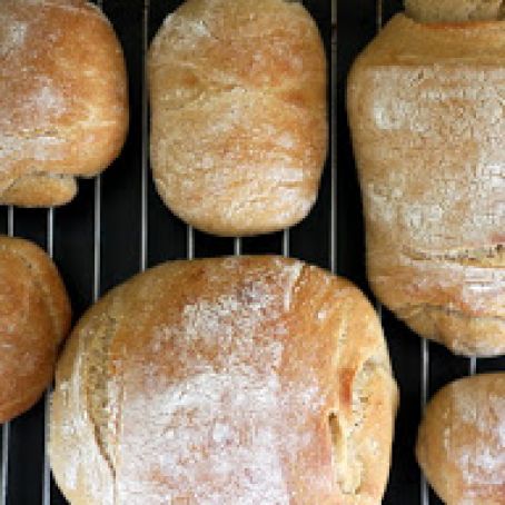 In a large bowl, sift together flours, salt, and yeast. Add two cups water and mix to combine, switching to kneading when it becomes too difficult to stir. If you have a stand mixer with a dough hook, this is the time to bust it out and put it to work. If you are kneading by hand, keep at it, but try to avoid adding more flour to the dough as you knead - ciabatta is supposed to have a wet dough. Knead for five minutes, or until dough is smooth but still sticky. Let dough rest, then add olive oil and knead for another minute. Add flour only if it is really too wet, ie: more of a batter than a dough. Place dough in bowl and cover in plastic wrap. Store in fridge for at least 12 hours and up to three days. About two hours before planning to serve ciabatta, remove dough from fridge. Being sure not to degas the dough, remove dough from bowl and divide into two or three pieces. (I divided mine into thirds and made four burger buns with the third piece.) Gently form each piece into a rectangle and fold into thirds. Roll each piece in flour gently and then place seam side down on a parchment lined baking sheet. Cover with a tea towel or plastic wrap and let rise for 45 minutes.