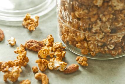 In lg. bowl combine popcorn, nuts, melter butter and sprinkle lightly with salt.