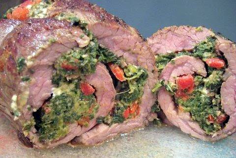 Showy main dish flank steak rolled and filled with spinach, roasted red peppers, blue cheese and more!