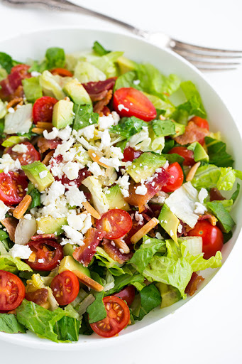 I love salads and how simple they are to throw together. They make for a quick dinner that is filling and (mostly) healthy. You can choose how much bacon you’d like to add. My family loves bacon – we fight over bacon :), so I added a fair amount to ours. It’s probably true though that a pound of bacon between four people isn’t very healthy, so if you are looking to make it a little healthier just cut back on the amount of bacon you add in. If you want to serve this as a main dish for dinner I recommend adding in some grilled chicken breast because it makes it more filling.