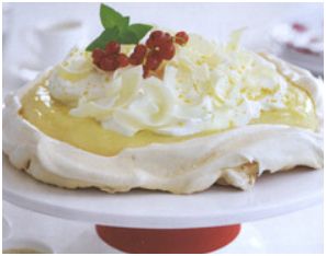 8. Spoon lemon filling into meringue shell. Whip cream until it holds its shape and spoon onto top of lemon filling. Scatter with white chocolate shavings and Lemon Dust, if using.