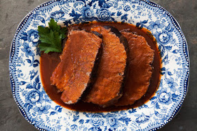 Cut the meat into roughly 1/2-inch-thick slices and pour the sauce over them. Serve with a bold red wine and crusty bread or mashed potatoes.