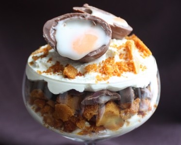 Now assemble your Cadbury creme egg mess. Layer honeycomb, Cadbury creme egg splats and whipped cream at least twice in a glass or sundae dish then top with a broken Cadbury creme egg and some honeycomb shards. Serve and sit back and enjoy, for Easter comes but once a year.