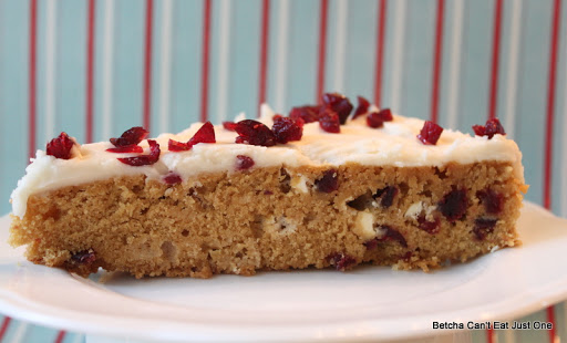 The cake is dense with a little hint of sweet crystalized ginger and studded with dried cranberries and white chocolate, and frosted with a lemon cream cheese frosting!