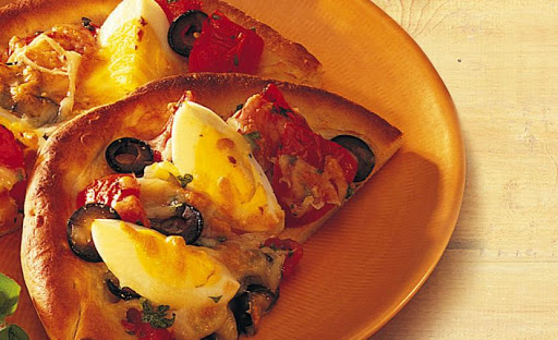 Étape 2 Mélanger les tomates, le basilic, l'ail et le poivre. Répartir uniformément sur le pain plat. Disposer les quartiers d'œufs sur le mélange aux tomates. Parsemer d'olives noires et de mozzarella et de parmesan sur le dessus.