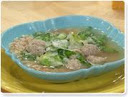 Season meat with salt and pepper; add ricotta, season with a little freshly grated nutmeg and add breadcrumbs, garlic, egg, grated cheese and EVOO; mix to combine. Use a small scoop to roll 24-30 walnut-sized balls. Add meatballs to broth and simmer 8-10 minutes. Wilt in greens and turn off heat; let stand 2 minutes and serve in shallow bowls.