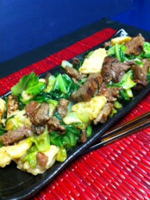 In a medium pan, heat the stove to medium-high. Add cooking oil and beef, stir until beef is defrosted. Add chopped Roman lettuce and water, stir. Add soy sauce, sugar, salt and pepper, stir well. Then add cooked dumplings and stir well.