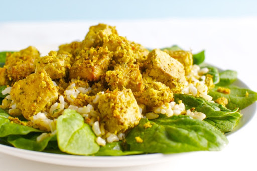 I like to serve this dish beginning with bed of spinach, followed by brown rice topped with the crusted tofu (and the remnants of the baked hummus).