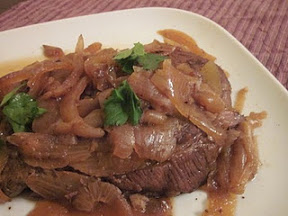 Place one onion in the crockpot, then the meat, then the rest of the ingredients on top. Cook on low for 4-5 hours.