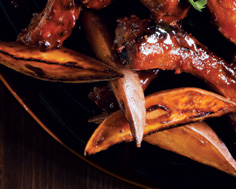 While ribs are braising in oven, cut 3 to 4 large unpeeled sweet potatoes into 8 wedges, lengthwise. Place potato wedges and 3 tbsp (45 mL) peanut oil in a large mixing bowl; turn potatoes until coated with oil. Place skin-side down on a rack on top of a baking tray placed low in 375°F (190°C) oven with ribs for 30 minutes. Remove from oven; let stand while ribs finish braising. (Potatoes can be covered and refrigerated for up to 2 days.) When ready to proceed, place oven rack on highest position. Turn wedges on side, still on rack, and bake 15 minutes in 425°F (220°C) oven (about 10minutes longer for chilled potatoes). Turn potatoes to other side. Bake 15 minutes or until richly browned in spots. Sprinkle with pinches of smoked salt; serve right away