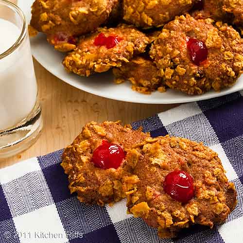 Cherry Winks are flavored with dates, pecans, and maraschino cherries, and finished with a crunchy corn-flake coating. They have a faint almond-like taste, no doubt from the maraschino cherries.