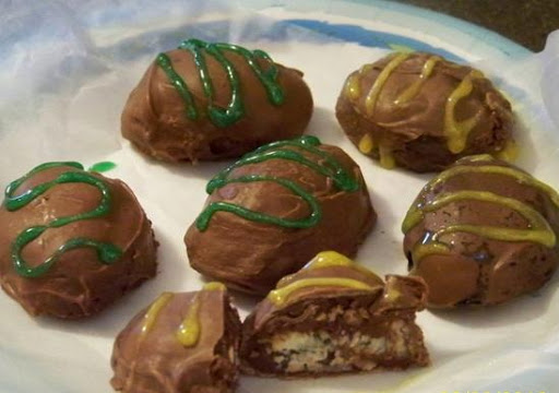 Using a spoon drop a tablespoon of chocolate mix onto waxed paper lined cookie sheets. Flatten out the chocolate, spoon about 1/2 teaspoon of coconut onto chocolate in center add almond. Fold the chocolate mixture over the coconut filling and shape into egg shapes. Freeze for 20 minutes.