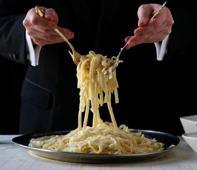 Mixing the ingredients on a warmed platter will help them melt quickly to make a satiny sauce. For the best results, use dried pasta, which doesn't break as easily during tossing as fresh egg pasta does.