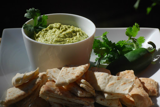 To the cilantro, jalapenos and garlic, add chick peas and lemon/water mix. Puree and scrape sides as needed. Add salt, cumin and cayenne and slowly pour in tahini/oil mixture. Puree again and scrap down sides until well combined.