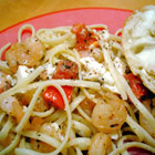 Toss hot pasta with shrimp, tomato sauce and feta. Feta will melt slightly. Serve.