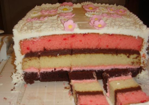 Bake each cake mix according to manufacturers directions. (Can be baked in 9x13 pans or 9" rounds, round cake will yield 2 completed cakes.)